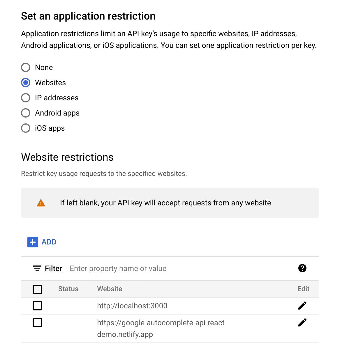 Under “Set an application restriction”, select Website and then configure the domains that you’re expecting to use. You can always modify this later if you don’t know yet.