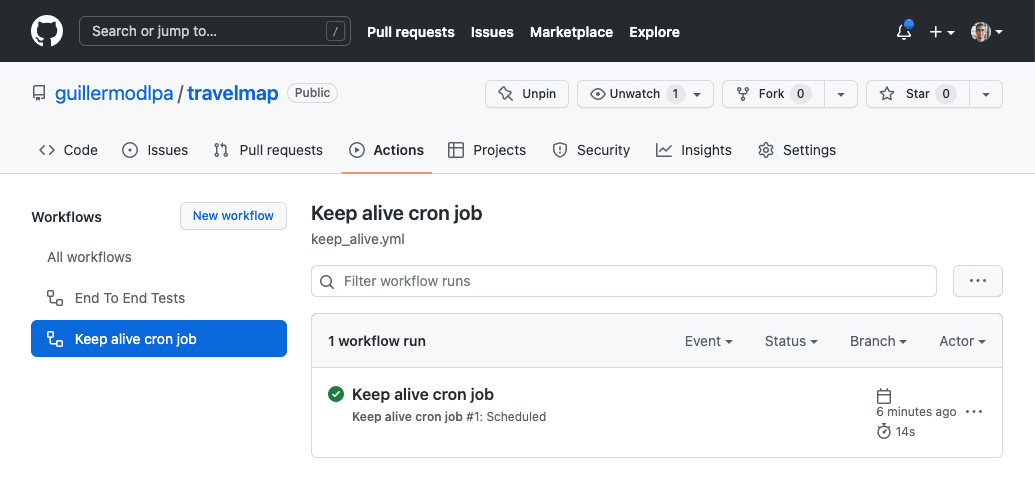 Opening the Actions view at the scheduled time… voilà, I had the “keep alive” workflow running daily and ensuring my Planetscale free database never went into sleep mode.